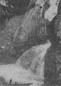 Дальнейший путь лежит по левобережным прерывистым террасам Каралазургера (см. рис. 24 и 22). До аула Гочоб идет хорошая грунтовая дорога, набор высоты постепенный. Большая часть долины луговая. На склонах, обращенных к северу, преимущественно по правобережью сосновые леса. Склоны долины крутые, часто обрывистые, с щебнистыми осыпями у подножий. Много поперечных отрогов. В 6 км выше аула Гочоб река течет в ущелье шириной по дну 5—15 м. На всем протяжении склоны через 0,6—1,5 км рассечены оврагами. Русло порожистое. Пороги высотой до 1 м образованы в основном выходами скальных пород. По дороге в верховья реки встречаются крупные аулы Гочада, Сумета, Гочоб, несколько селений поменьше.