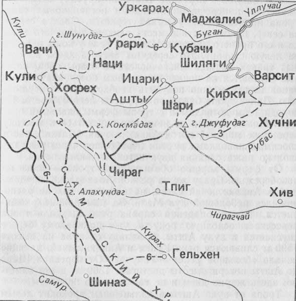 Трона от аула Ашты в дальнейшем проходит левым берегом Уллучая. До аула Ицари встречаются еще два селения — Худуц и Санжи. Уклон тропы невелик. У моста через Уллучай в ауле Ицари отметка реки около 1300 м. Отсюда начинается подъем к еще далекому перевалу Буршаг. Надо подняться на некрутой отрог и спуститься с него в долину реки Шари. С небольшого перевала в отроге в верховьях Шари видна высокая стена хребта Джуфудаг. Перед аулом Шари перейти реку и, пройдя аул, двигаться тропой на юг. Долина постепенно сужается и переходит в узкое ущелье. Характерно, что Шари имеет в основном правые притоки и правобережье ее более полого, чем крутые склоны северного отрога хребта Джуфудаг, тянущегося по левому берегу Шари.