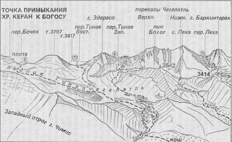 За ручьем поле цветущих рододендронов. Пологий подъем на северный отрог Тинавчегелатля (3542 м), откуда уже видны бурная река Тинав и широкий язык ледника Тинавчегелатль (рис. 7). Следует спуститься к реке, но, не доходя до нее 20—30 м, выйти по склонам средней сложности к ледовому языку (около 3250 м). Ледник спокойный, без стен и трещин. Через 0,5 км движения по нему показывается перевал Тинав Западный с характерными скальными “штанами” на склоне гребня. Дальше надо идти так, чтобы по правую руку остались перевал Тинав Западный, скалистый пик Эдерасо (3672 м) и глубокий врез перевала Тинав Восточный. Прямо на юге, в гребне Богосского хребта, вырастает горб вершины 3707 м. Следует обойти короткий северный отрог ее. Крутизна в этом месте 25—30°, встречаются неширокие трещины. По леднику идти обязательно в связках. Постепенно огибая вершину 3707 м, можно увидеть широкую седловину и небольшой скальный сброс над ней. Вверх по леднику четко обрисовывается скально-ледовая башня горы Чимис (4099 м). Перед перевалом ледник выполаживается.